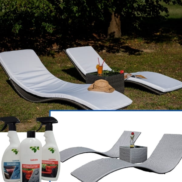 Zestaw środków do czyszczenia i impregnacji mebli ogrodowych oraz tkanin.