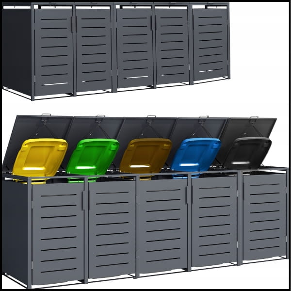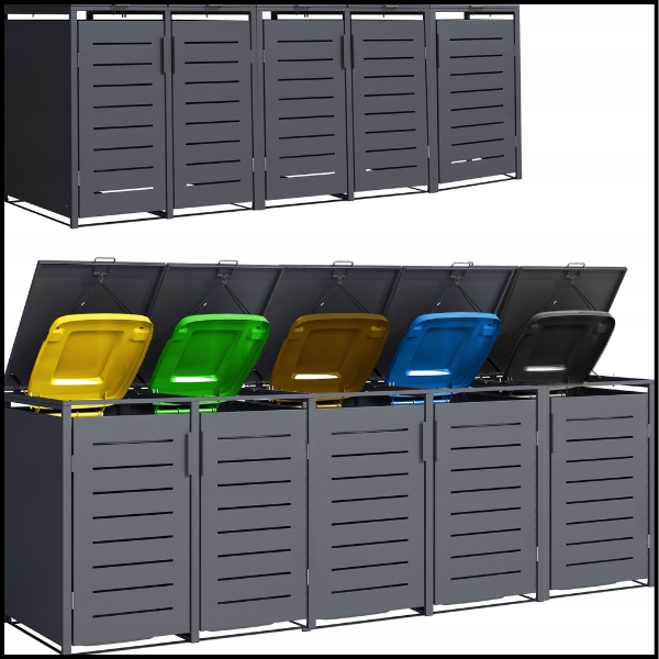 - Dopasowana do pięciu pojemników o pojemności 240 litrów – idealne rozwiązanie dla każdego podwórka czy ogrodu.