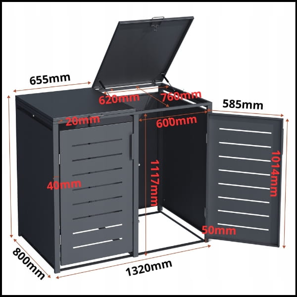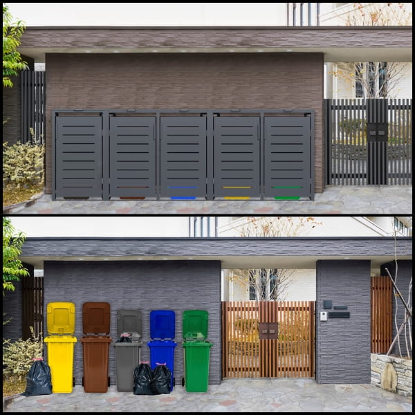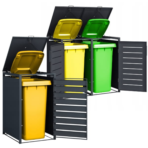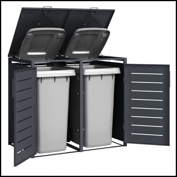Osłona została specjalnie zaprojektowana z myślą o pięciu standardowych pojemnikach na odpady o pojemności 240 oraz 120 litrów co zapewnia idealne dopasowanie i wygodne użytkowanie. Dzięki niej kosze są schowane i chronione przed wiatrem, zwierzętami oraz nieestetycznym wyglądem, a jednocześnie pozostają łatwo dostępne w każdej chwili.