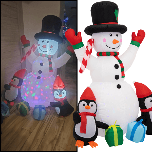 - Wbudowany kompresor – automatycznie napełnia bałwana powietrzem, dzięki czemu dekoracja jest gotowa do użytku w zaledwie kilka chwil, bez potrzeby ręcznego pompowania.