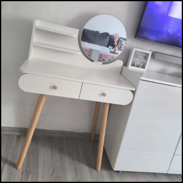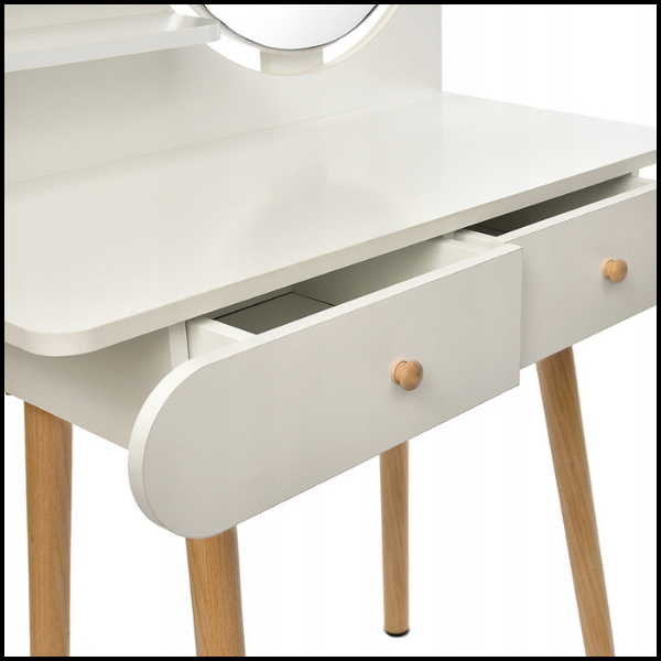 Okrągły kształt lustra podkreśla nowoczesny i elegancki design toaletki, a jego duża powierzchnia gwarantuje pełną funkcjonalność w codziennych rytuałach. To rozwiązanie, które łączy estetykę, praktyczność i wygodę, czyniąc toaletkę nie tylko pięknym, ale i niezwykle użytecznym meblem.