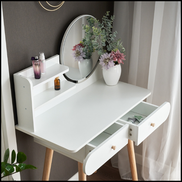 Półeczki nie tylko zwiększają funkcjonalność toaletki, ale także podkreślają jej nowoczesny i estetyczny wygląd w stylu skandynawskim. To praktyczne rozwiązanie, które pozwala utrzymać porządek i nadaje wnętrzu lekkości oraz elegancji.