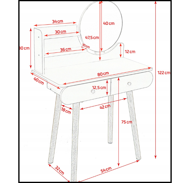 Dzięki wymiarom 80 cm szerokości, 40 cm głębokości i 122 cm wysokości toaletka nie zajmuje dużo miejsca, a jednocześnie zapewnia komfort użytkowania. Mebel jest stabilny, waży 18 kg i przeznaczony do samodzielnego montażu, z dołączoną instrukcją.
