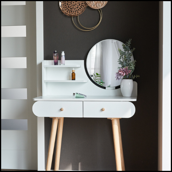 Płyta MDF pokryta melaminą gwarantuje wysoką trwałość, odporność na zarysowania oraz łatwość w utrzymaniu czystości. Dzięki białemu matowemu wykończeniu toaletka prezentuje się wyjątkowo elegancko i nowocześnie, a jednocześnie doskonale komponuje się z różnymi aranżacjami wnętrz – od skandynawskich po klasyczne.
