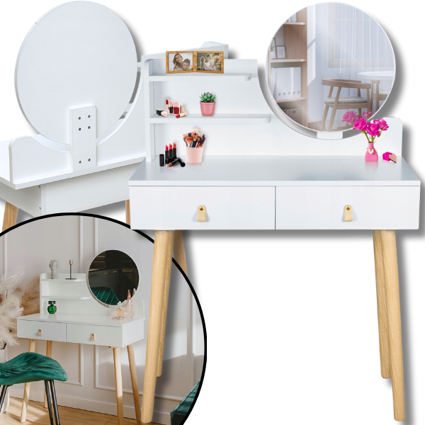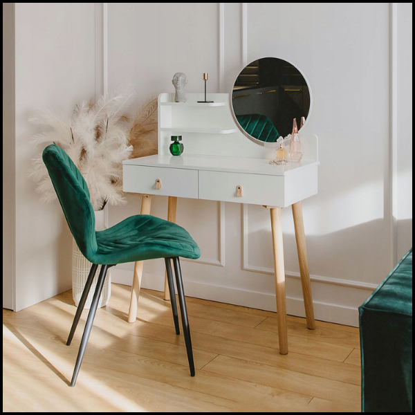 Okrągły kształt lustra podkreśla nowoczesny i elegancki design toaletki, a jego duża powierzchnia gwarantuje pełną funkcjonalność w codziennych rytuałach. To rozwiązanie, które łączy estetykę, praktyczność i wygodę, czyniąc toaletkę nie tylko pięknym, ale i niezwykle użytecznym meblem.