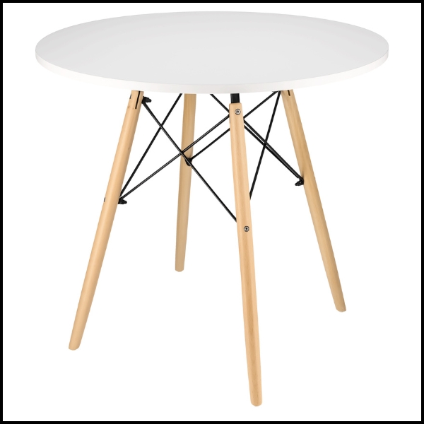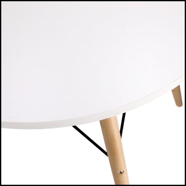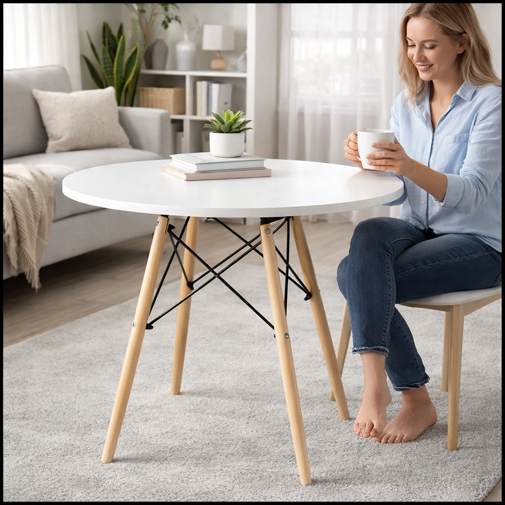 Ten okrągły stół w stylu skandynawskim doskonale odnajdzie się w salonie, jadalni oraz kuchni, tworząc spójną i estetyczną przestrzeń do codziennego użytkowania. Blat wykonany z wysokiej jakości białej płyty MDF wyróżnia się gładką powierzchnią, odpornością na zabrudzenia oraz łatwością czyszczenia, co znacząco podnosi komfort użytkowania.