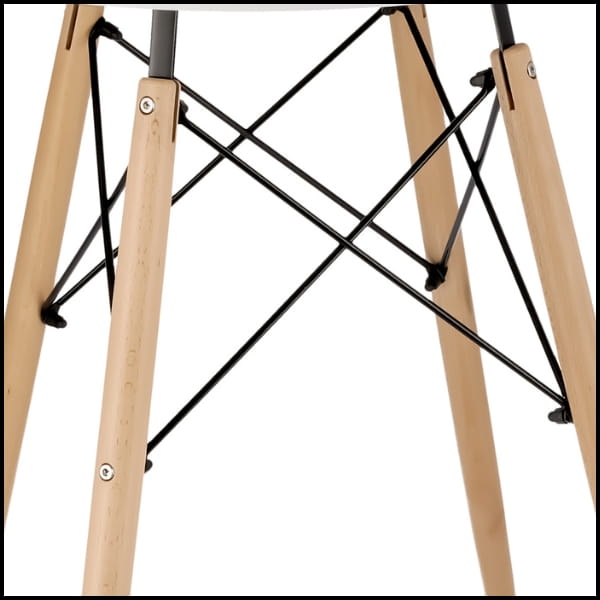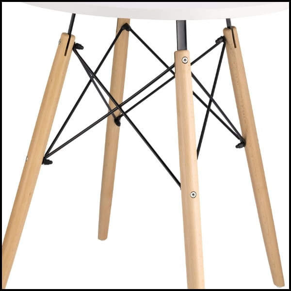 Konstrukcję stołu tworzą solidne drewniane nogi, wzmocnione metalowym wspornikiem, który zwiększa stabilność i trwałość całego mebla. Takie połączenie materiałów nadaje stołowi nowoczesny, a jednocześnie naturalny charakter, typowy dla skandynawskiego wzornictwa.