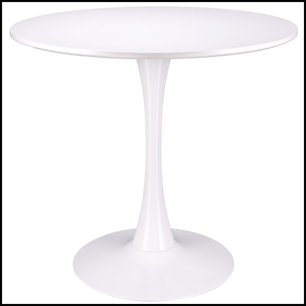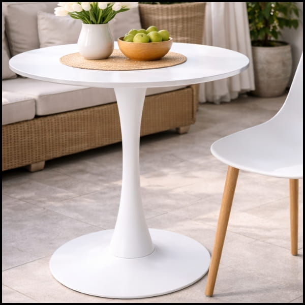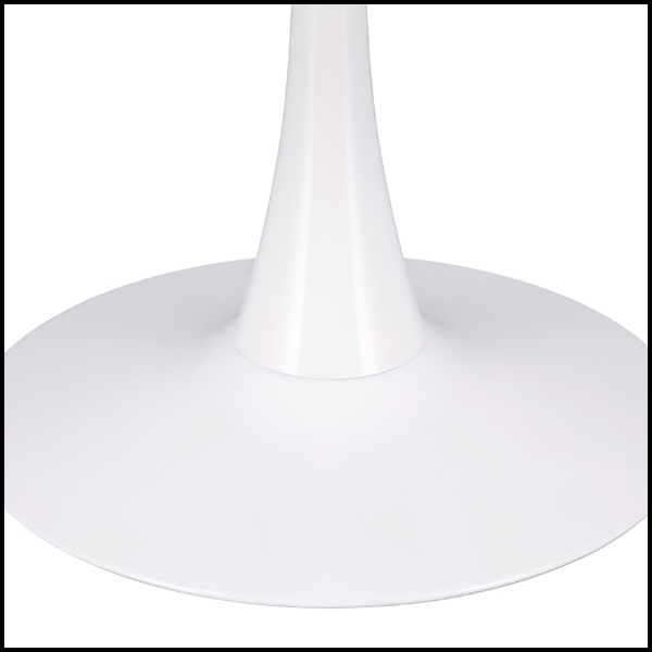 Model opiera się na stabilnej centralnej stopie, gwarantującej pewne podparcie i wysoki komfort użytkowania. Jednolite białe wykończenie blatu, nogi oraz podstawy nadaje meblowi elegancki, nowoczesny charakter, który łatwo dopasować do różnych aranżacji wnętrz.