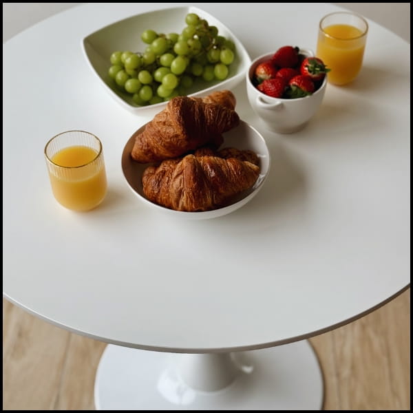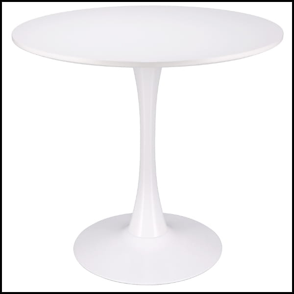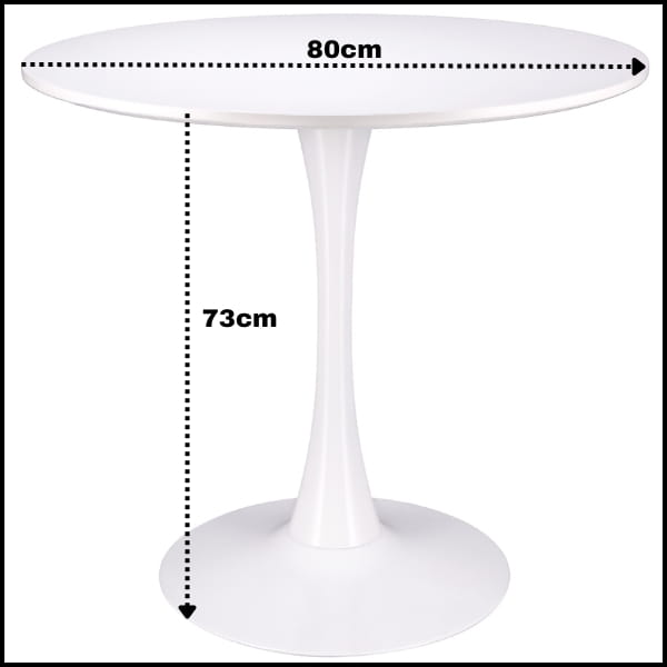 Okrągły stół to praktyczne i stylowe rozwiązanie do salonu, jadalni oraz kuchni. Blat wykonano z wysokiej jakości białej płyty MDF, która charakteryzuje się gładką powierzchnią, odpornością na codzienne użytkowanie oraz łatwością czyszczenia. Centralna pojedyncza noga z szeroką, stabilną podstawą zapewnia doskonałą równowagę, trwałość oraz komfort użytkowania.