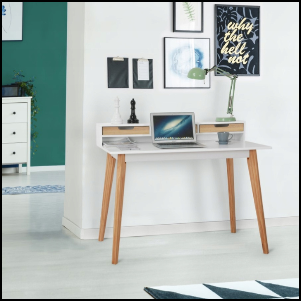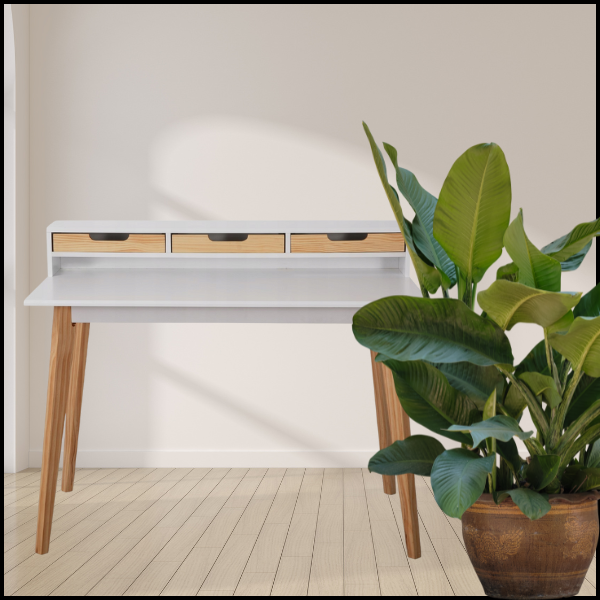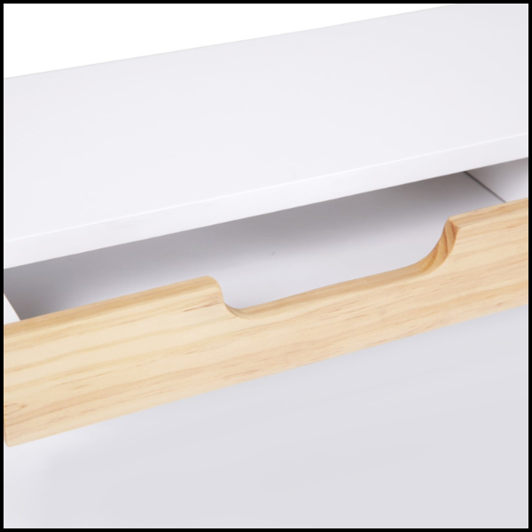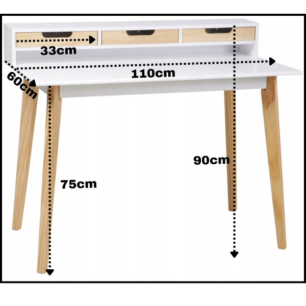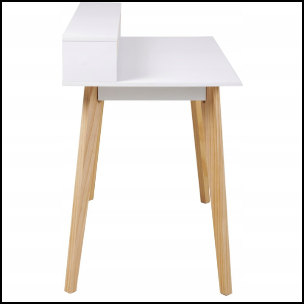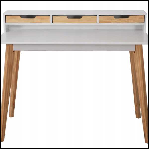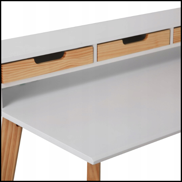 Biurko wyposażono w 3 praktyczne szuflady, umieszczone na podwyższeniu, co zapewnia łatwy dostęp do przechowywanych przedmiotów bez konieczności schylania się. Każda szuflada posiada wycięty otwór na dłoń w kolorze drewna, który nie tylko ułatwia otwieranie, ale też dodaje stylowego, skandynawskiego akcentu.