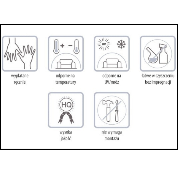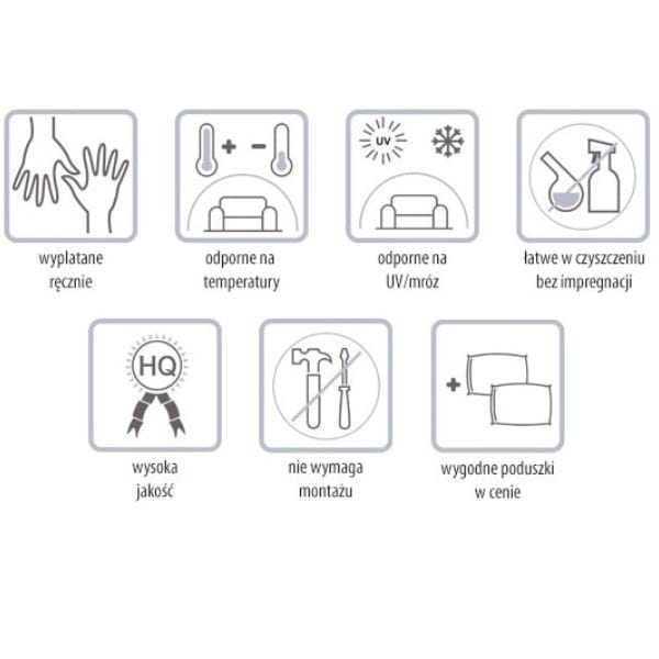 Zestaw wykonano z wysokiej jakości technorattanu, materiału o wyjątkowej trwałości, który skutecznie opiera się działaniu czynników atmosferycznych, takich jak deszcz, wilgoć czy promieniowanie UV. Dzięki temu meble zachowują swój estetyczny wygląd przez wiele sezonów, nie wymagając skomplikowanej konserwacji.