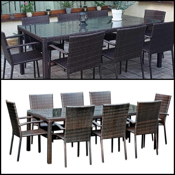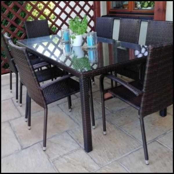 ➡️1x duży stół - Stół wyposażony jest w szklany, przezroczysty blat wykonany z 5 mm szkła bezpiecznego, które jest nie tylko eleganckie, ale także odporne na uszkodzenia. Blat osadzony jest na plecionce technorattanowej, która wyróżnia się delikatną prążkowaną strukturą w odcieniu brązu. Dzięki temu stół zyskuje wyjątkowy, naturalny wygląd, który pasuje do różnych stylów ogrodowych.