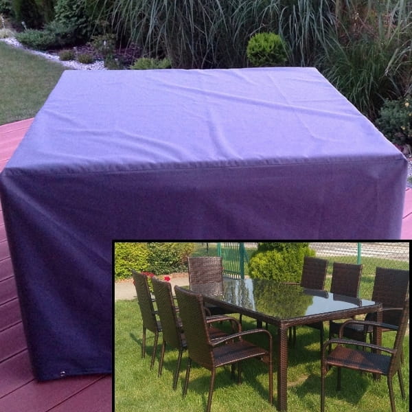 Pokrowiec jest jednoczęściowy. Posiada u dołu sznurek ściągający, który gwarantuje zabezpieczenie w czasie silniejszego wiatru.  Pokrowiec został uszyty na meble złożone, aby w czasie nieużytkowania zestaw zabierał jak najmniej miejsca.