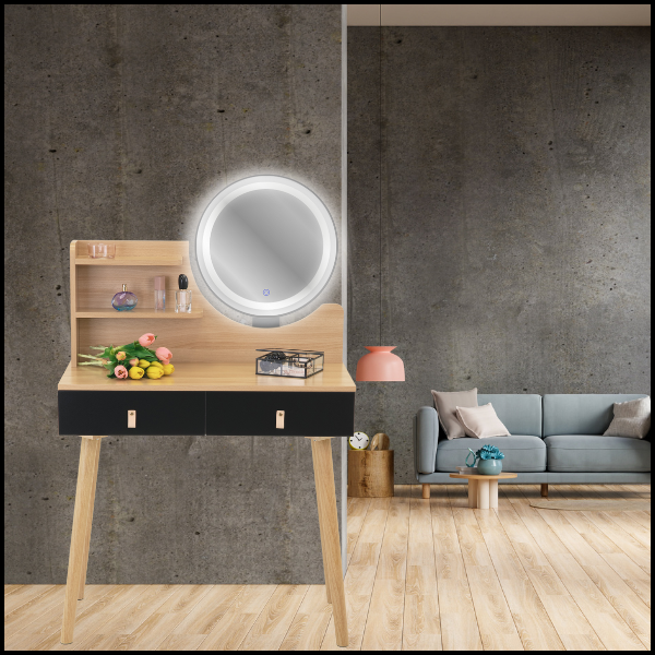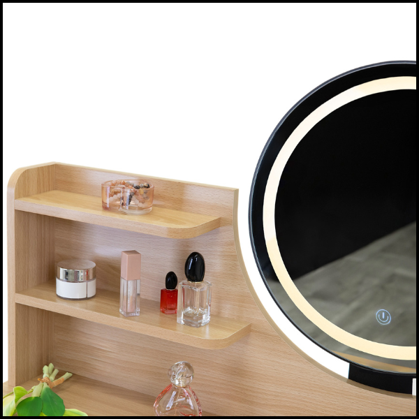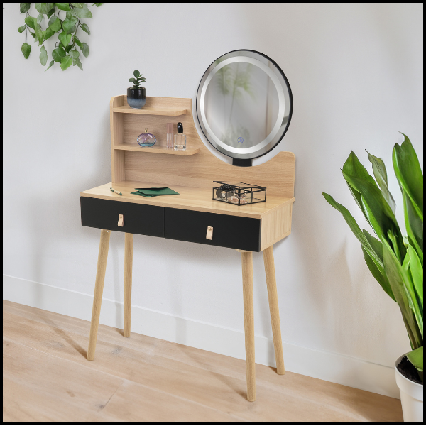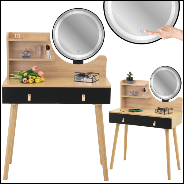 Odkryj bukową toaletkę 40x80 cm z podświetlanym lustrem LED, która łączy w sobie funkcjonalność, elegancję i nowoczesny design. Idealna do sypialni, pokoju młodzieżowego czy domowego gabinetu, pozwala zorganizować wszystkie kosmetyki i akcesoria w jednym miejscu, zachowując porządek i styl. Jej lekka, a jednocześnie stabilna konstrukcja gwarantuje wygodę codziennego użytkowania, a starannie dobrane detale, jak czarne fronty szuflad z owalnymi skórzanymi uchwytami oraz jasny blat w kolorze buku, podkreślają nowoczesny, skandynawski charakter mebla.