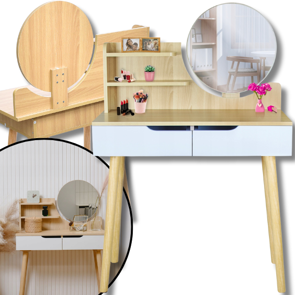Okrągły kształt lustra podkreśla nowoczesny i elegancki design toaletki, a jego duża powierzchnia gwarantuje pełną funkcjonalność w codziennych rytuałach. To rozwiązanie, które łączy estetykę, praktyczność i wygodę, czyniąc toaletkę nie tylko pięknym, ale i niezwykle użytecznym meblem.