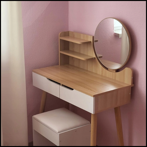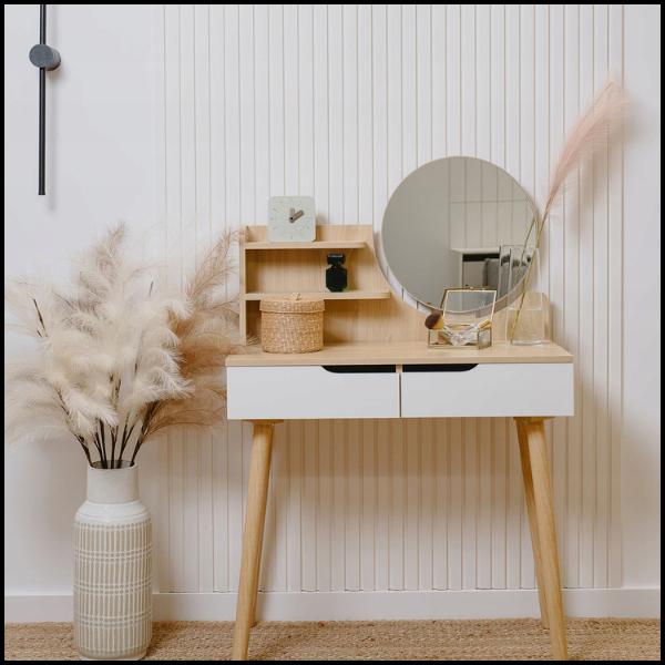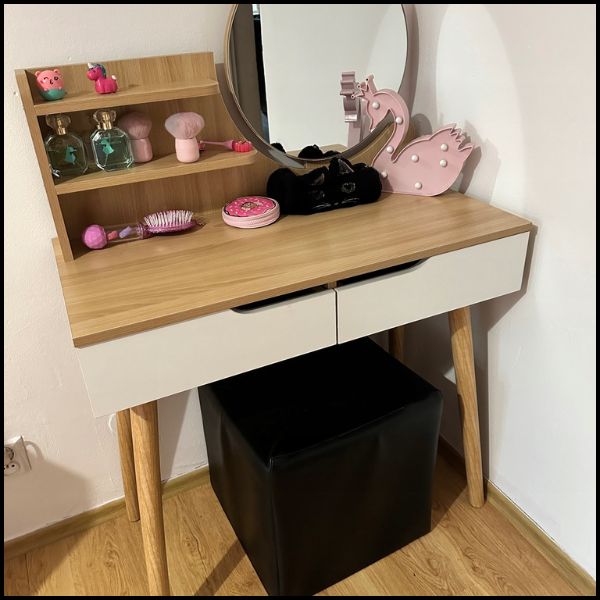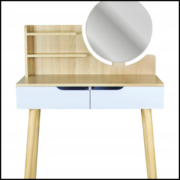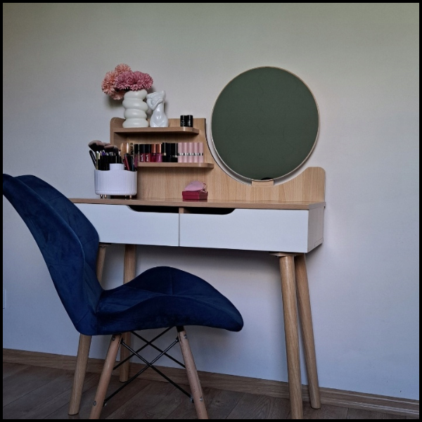 Półeczki nie tylko zwiększają funkcjonalność toaletki, ale także podkreślają jej naturalny, skandynawski charakter. Jasny buk wnosi do wnętrza przytulność i elegancję, doskonale komponując się z nowoczesnymi i klasycznymi aranżacjami. To rozwiązanie, które pozwala zachować porządek i jednocześnie ozdabia przestrzeń.
