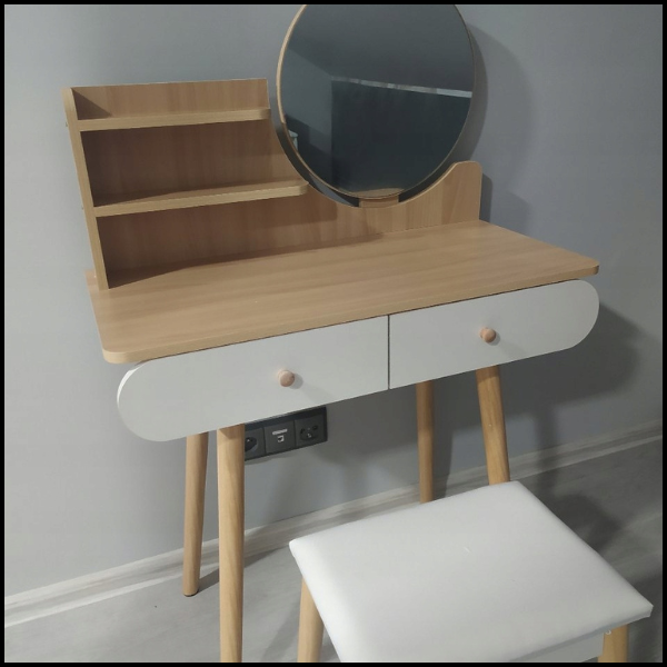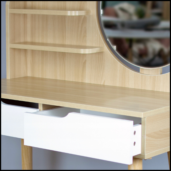 Naturalne drewno w odcieniu jasnego buku nadaje całości lekkości i ponadczasowego charakteru, idealnie komponując się z wnętrzami w stylu skandynawskim, nowoczesnym czy klasycznym. To połączenie funkcjonalności i estetyki, które sprawia, że biurko lub toaletka staje się nie tylko praktycznym, ale i dekoracyjnym elementem pomieszczenia.