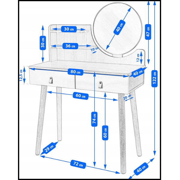 Okrągły kształt lustra doskonale wpisuje się w nowoczesny i elegancki design toaletki, podkreślając jej estetykę i dodając lekkości całej konstrukcji. Dzięki idealnym proporcjom i odpowiedniej wysokości montażu, lustro jest nie tylko stylowe, ale przede wszystkim funkcjonalne i wygodne w codziennym użytkowaniu.