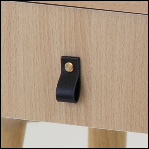 - Uchwyty szuflad ze skórzanym czarnym paskiem.