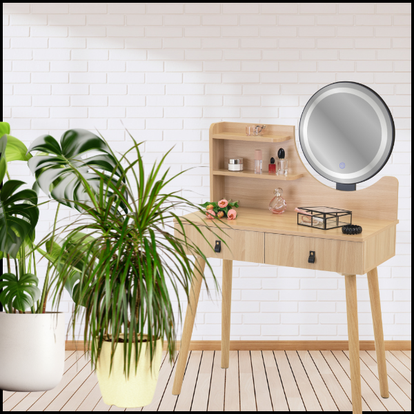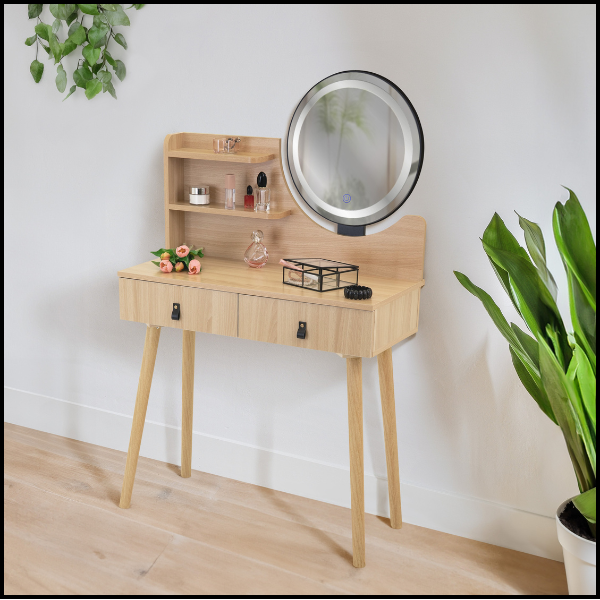 Odkryj bukową toaletkę 40x80 cm z podświetlanym lustrem LED, która łączy nowoczesny design z praktycznym rozwiązaniem do Twojego wnętrza. Ten elegancki mebel w naturalnym odcieniu jasnego buku doskonale sprawdzi się w sypialni, pokoju młodzieżowym czy domowym gabinecie, oferując funkcjonalność i styl w jednym. Dzięki solidnej konstrukcji z drewna i lekkiej, wytrzymałej płyty MDF toaletka jest stabilna, trwała i łatwa w utrzymaniu. Skórzane uchwyty, zaokrąglone krawędzie blatu i LED-owe lustro sprawiają, że codzienne korzystanie z mebla staje się komfortowe i przyjemne.