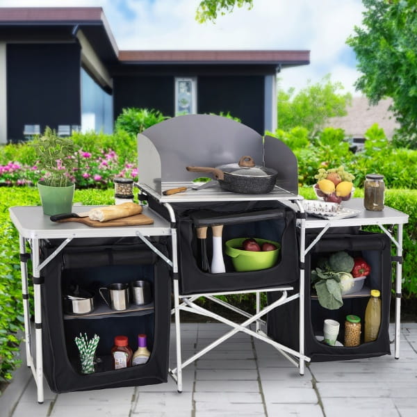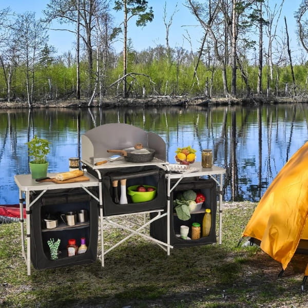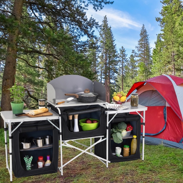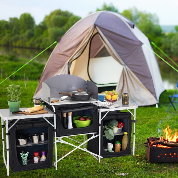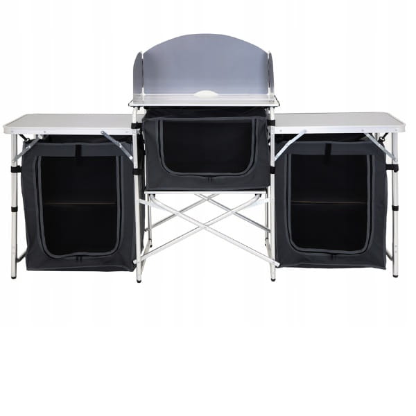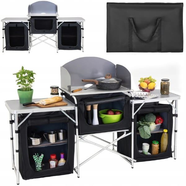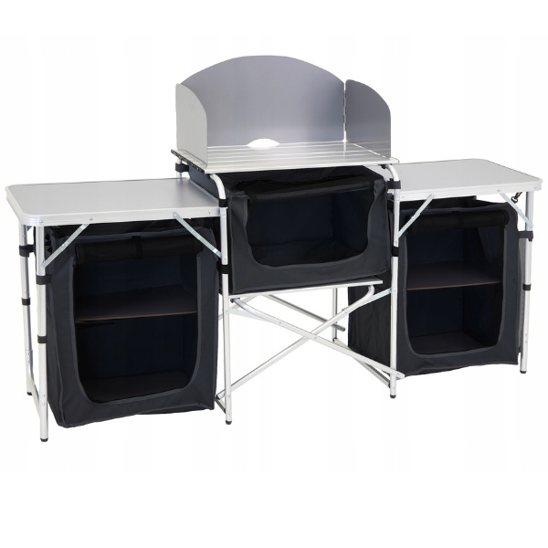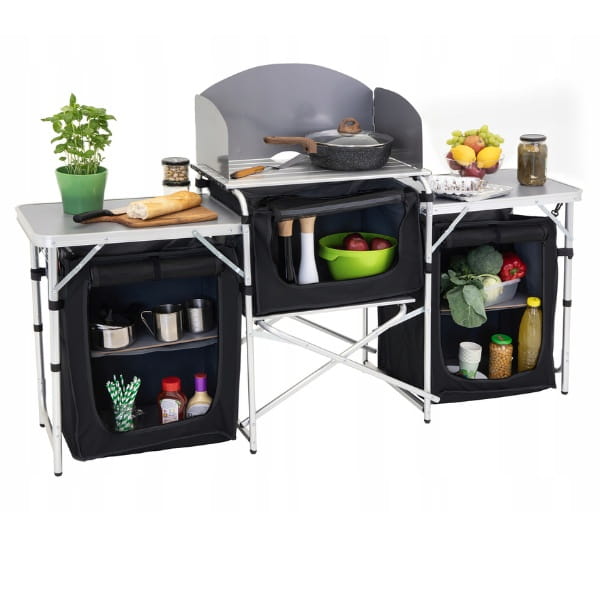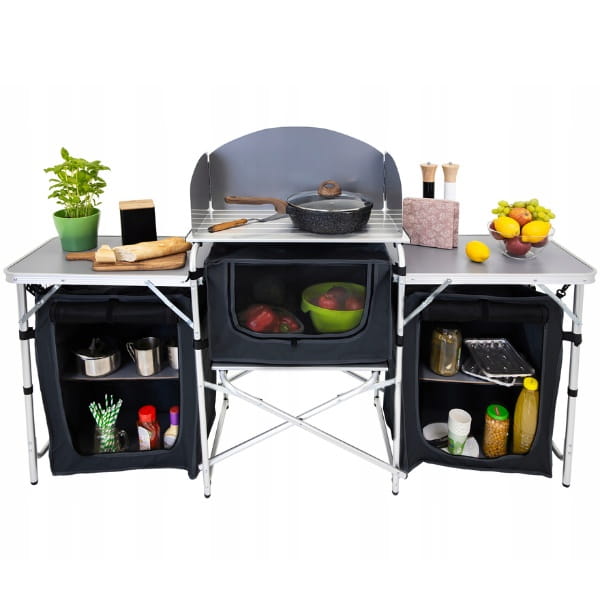 Turystyczna kuchnia jest wyposażona w metalowy blat, który można używać do ustawienia kuchenki. Zestaw zawiera podwieszaną szafkę z utwardzonymi półkami, umożliwiającymi przechowywanie żywności, naczyń oraz innych niezbędnych akcesoriów.
