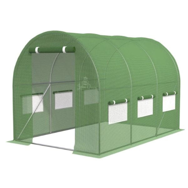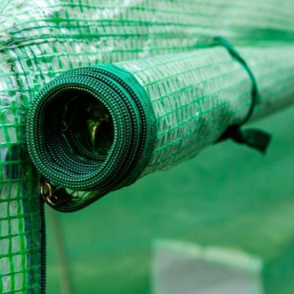Folia na tunel ogrodowy ma okna z moskitierą, dodatkowo wyposażone w roletę na zamek błyskawiczny. Zrolowaną roletę można zabezpieczyć paskami z zapięciem, a gdy jest rozłożona, przypiąć ją do tunelu. To umożliwia łatwe zamknięcie okien i zapewnia kontrolę nad wentylacją.