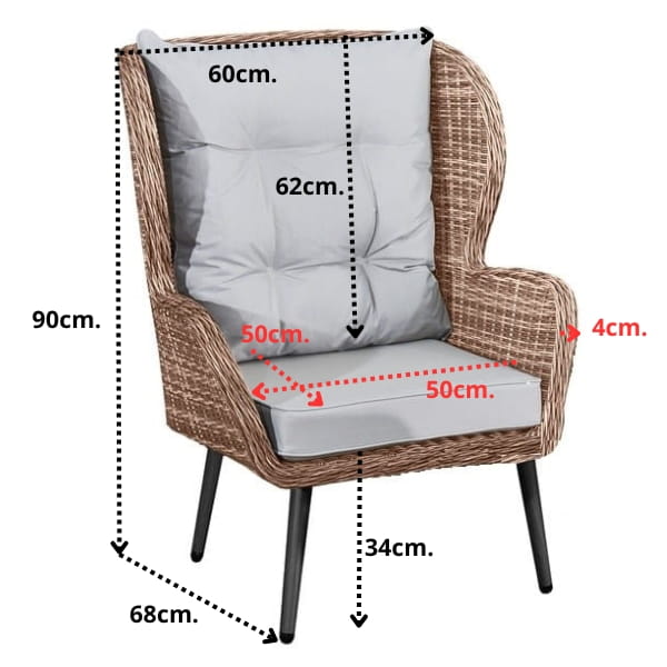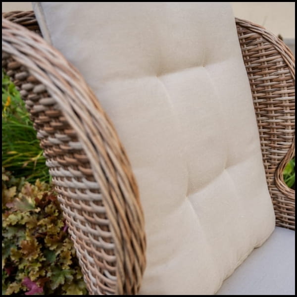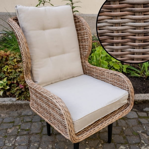 Plecionka z technorattanu nadaje mu nowoczesny wygląd, a jednocześnie zapewnia wysoką odporność na promieniowanie UV, wilgoć, deszcz i mróz. Dzięki temu fotel zachowuje swój estetyczny wygląd przez wiele lat, nie wymagając skomplikowanej konserwacji.