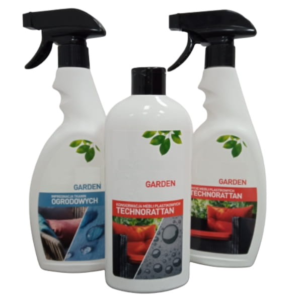 Zestaw środków do czyszczenia i impregnacji mebli ogrodowych oraz tkanin.