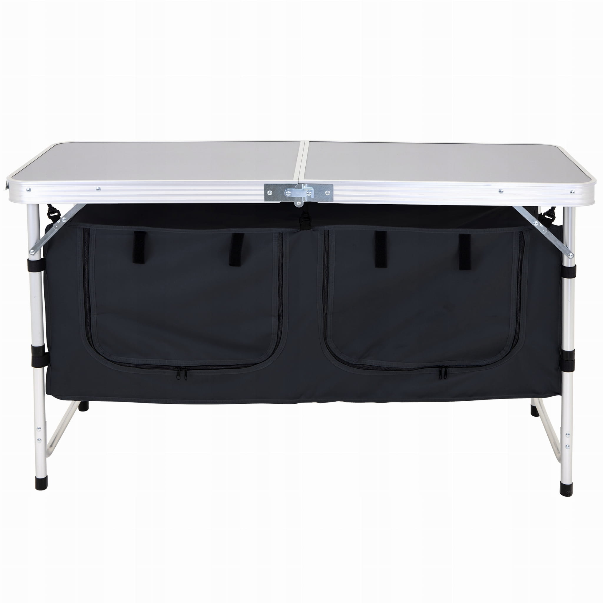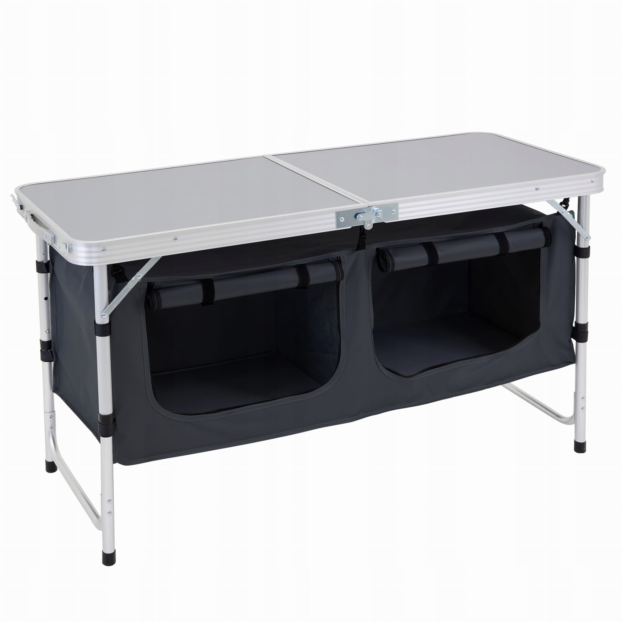 • Kempingowy stół kuchenny ma regulowaną wysokość 22-28 cali / 56-71 cm. Prosty przycisk regulacji ułatwia  zmianę wysokości.