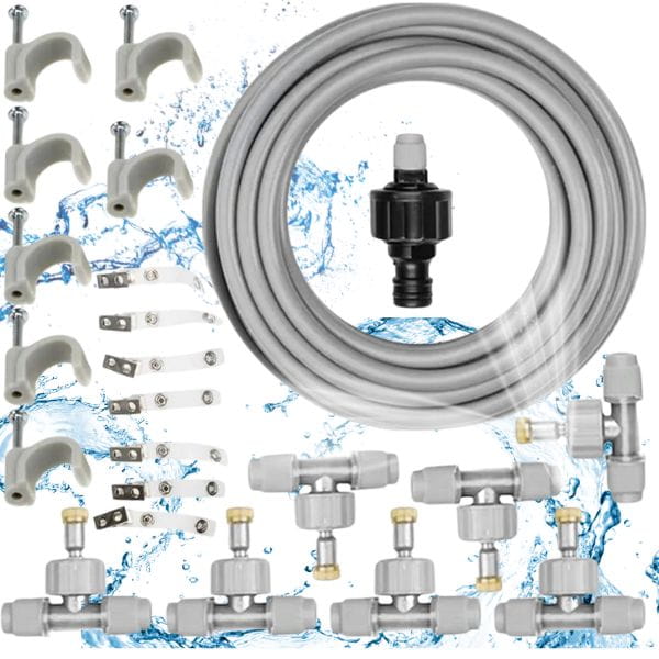 Cały system można podłączyć do standardowego węża ogrodowego za pomocą dołączonej szybkozłączki. W zestawie znajduje się również filtr, który wydłuża żywotność dysz, zmniejszając osadzanie się kamienia oraz chroniąc dysze przed drobnymi zanieczyszczeniami z wodociągów lub studni.