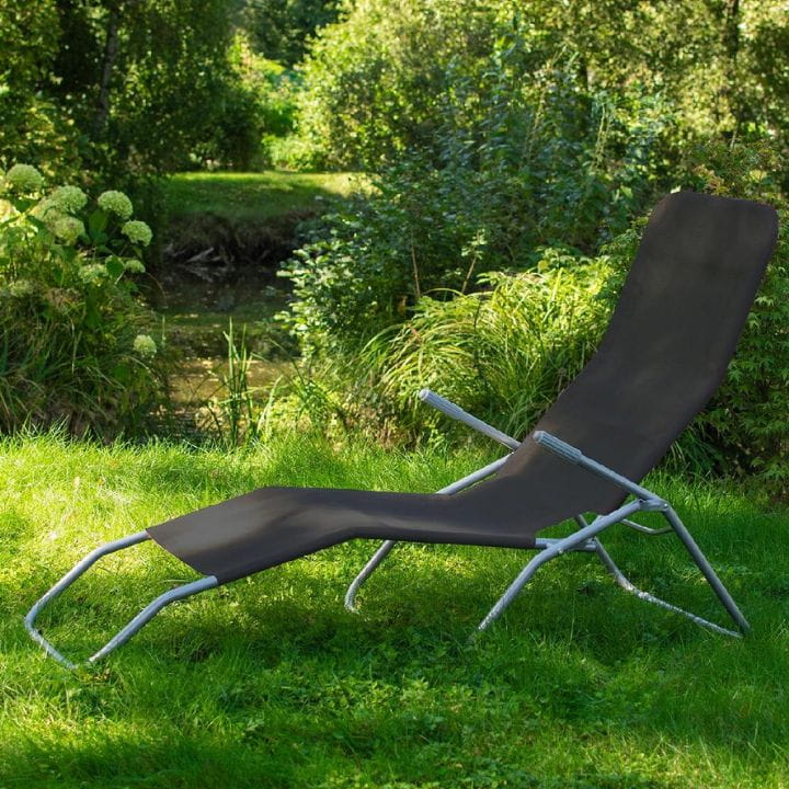 Rozkładany leżak ogrodowy, który znakomicie sprawdzi się podczas wypoczynku w przydomowym ogrodzie lub na plaży.
