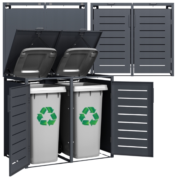 - Dopasowana do dwóch pojemników o pojemności 240 litrów – idealne rozwiązanie dla każdego podwórka czy ogrodu.