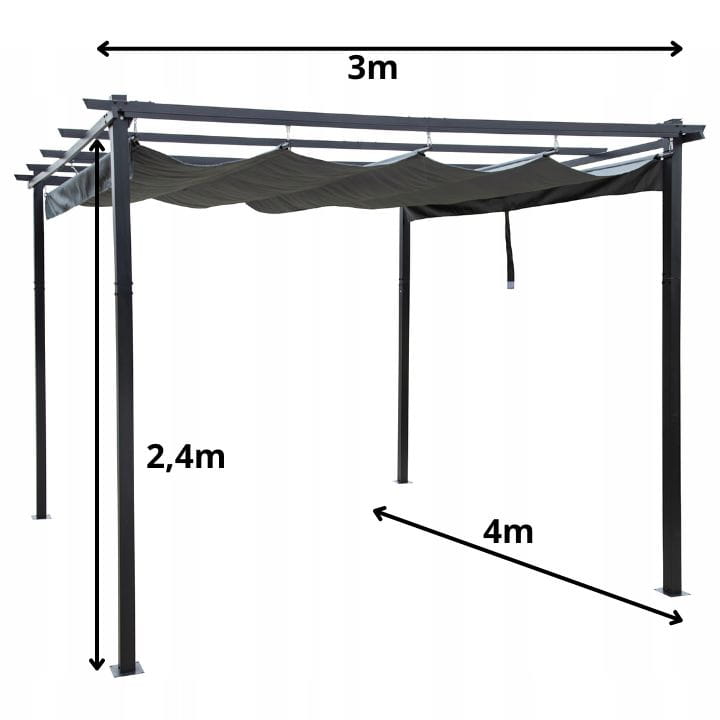 Optymalne wymiary - Wymiary 3 x 4 metry oraz wysokość 2,4 metra zapewniają komfortową przestrzeń, a odpowiednie odległości między nogami pergoli ułatwiają jej dopasowanie do różnych ustawień w ogrodzie.