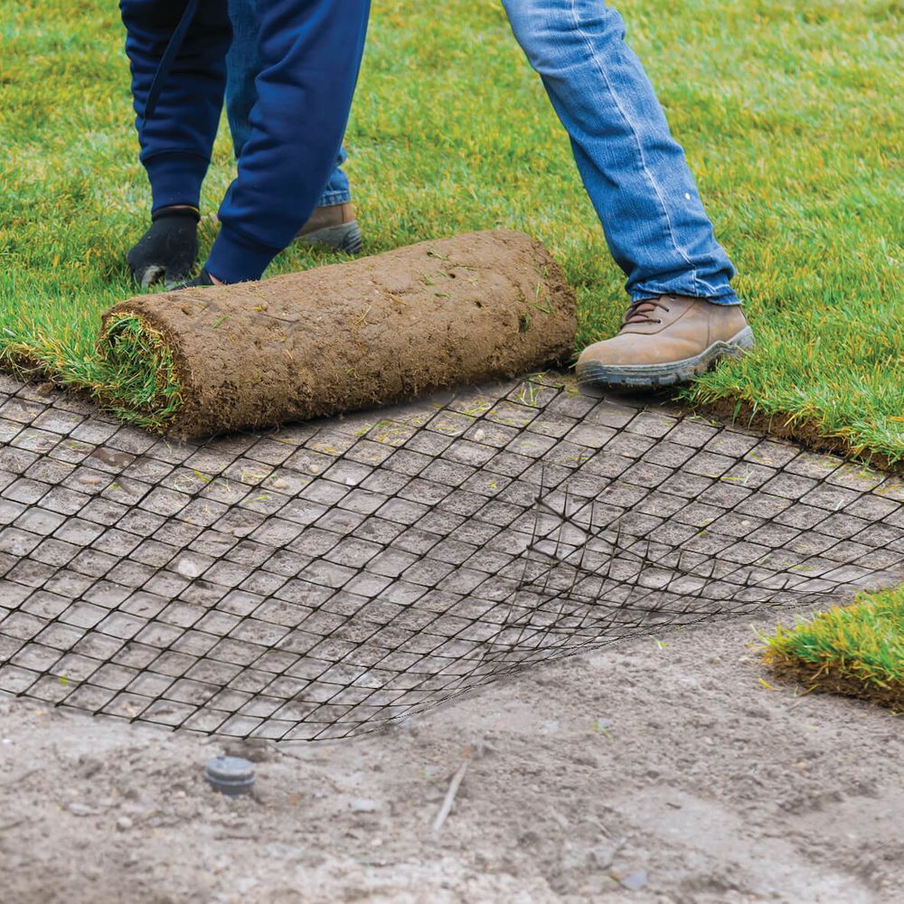 • Siatka o odpowiednio dobranym rozmiarze oczek i wadze wzmacnia strukturę ziemi, dzięki czemu rośnie na niej znacznie silniejsza trawa.