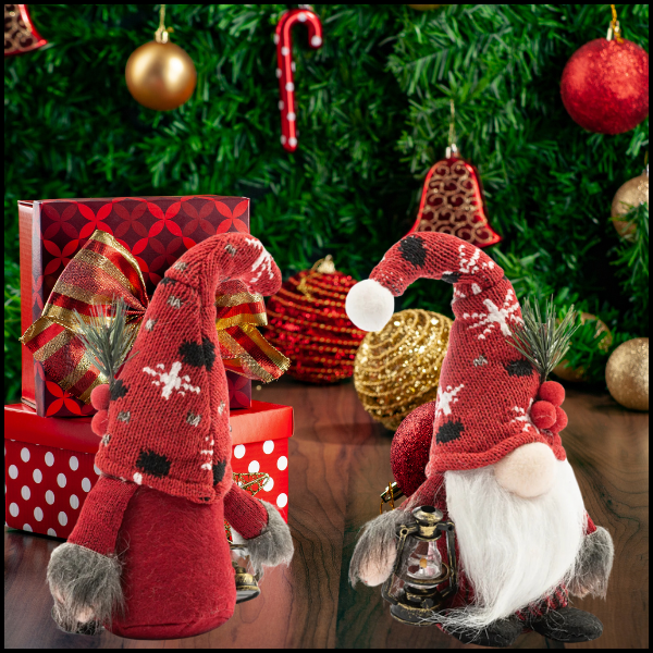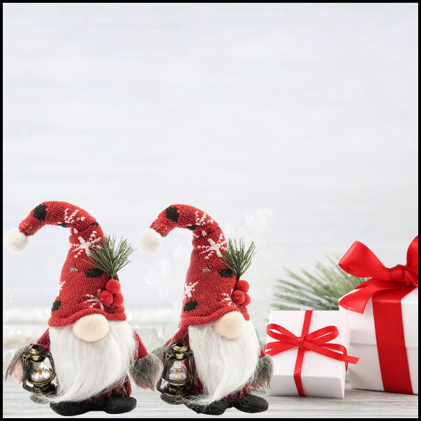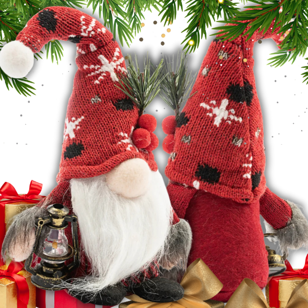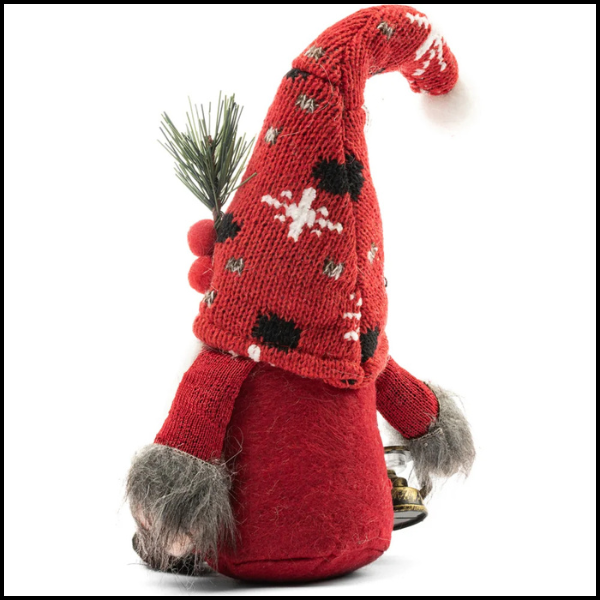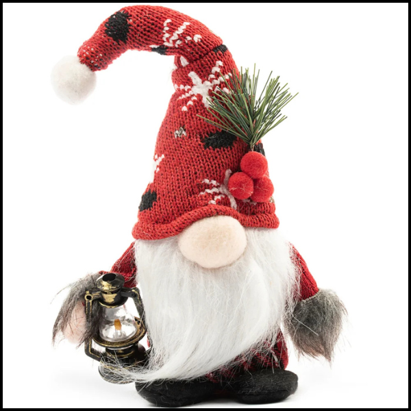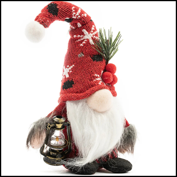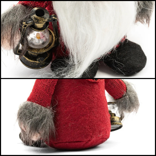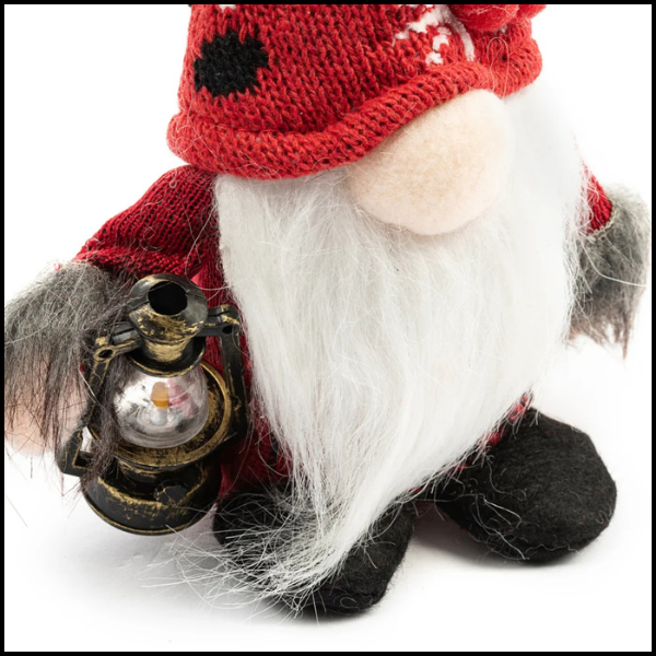 W jednym ręku skrzat trzyma małą latarnię, która kojarzy się z światłem i ciepłem podczas mroźnej zimy, dodając magii i blasku świątecznej atmosferze.