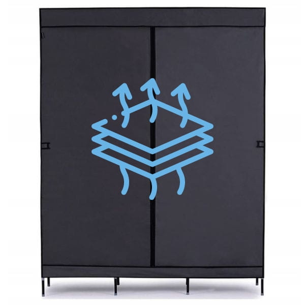 Ponadto pokrowiec szafy jest oddychający - poprzez stały dopływ świeżego powietrza chroni ubrania przed duszącym zapachem, który powoduje zwykle dyskomfort w trakcie zakładania ubrań wyciągniętych z szafy.
