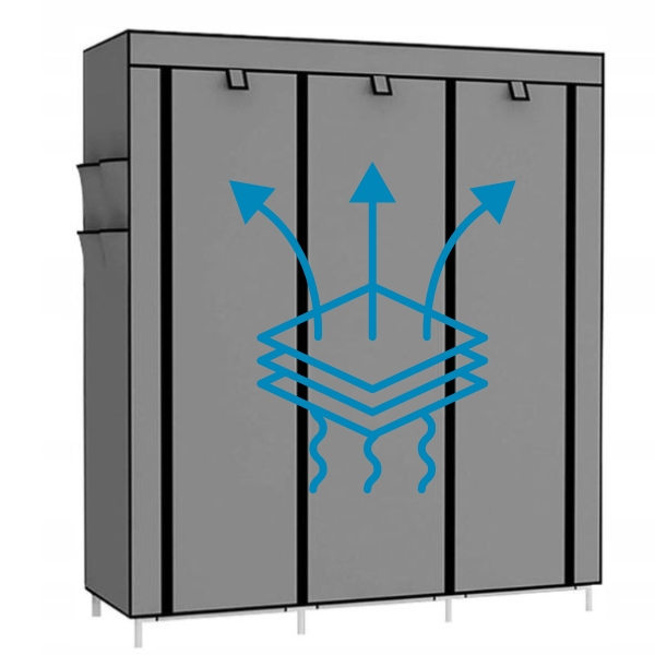 Ponadto pokrowiec szafy jest oddychający - poprzez stały dopływ świeżego powietrza chroni ubrania przed duszącym zapachem, który powoduje zwykle dyskomfort w trakcie zakładania ubrań wyciągniętych z szafy.