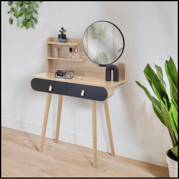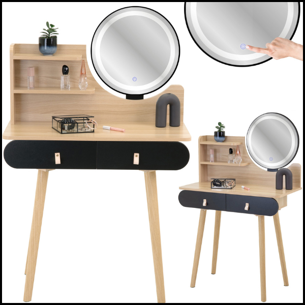 Odkryj nowoczesną toaletkę w stylu skandynawskim, która łączy elegancję z funkcjonalnością. Jej jasny bukowy blat w połączeniu z czarnymi, owalnymi frontami szuflad i skórzanymi uchwytami tworzy wyjątkowy mebel, który będzie ozdobą każdej sypialni czy pokoju kosmetycznego. To idealne rozwiązanie dla osób ceniących porządek, wygodę i estetykę w jednym. Dzięki podświetlanemu lustru LED każdy poranek stanie się przyjemniejszy, a codzienna pielęgnacja i makijaż – znacznie wygodniejsza.