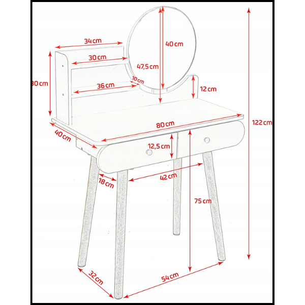 Okrągły kształt lustra doskonale wpisuje się w nowoczesny i elegancki design toaletki, podkreślając jej estetykę i dodając lekkości całej konstrukcji. Dzięki idealnym proporcjom i odpowiedniej wysokości montażu, lustro jest nie tylko stylowe, ale przede wszystkim funkcjonalne i wygodne w codziennym użytkowaniu.