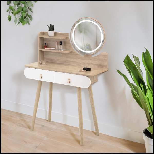 Odkryj stylową i funkcjonalną toaletkę bukową 40x80 cm z lustrem LED, która łączy w sobie nowoczesny design, praktyczne rozwiązania i wysoką jakość wykonania. Ten wyjątkowy mebel został zaprojektowany z myślą o osobach, które cenią porządek, wygodę i elegancki wygląd wnętrza. Blat w kolorze jasnego buku, białe owalne fronty szuflad ze skórzanymi uchwytami oraz podświetlane lustro LED tworzą harmonijną całość, doskonale pasującą do wnętrz w stylu skandynawskim, nowoczesnym czy klasycznym.