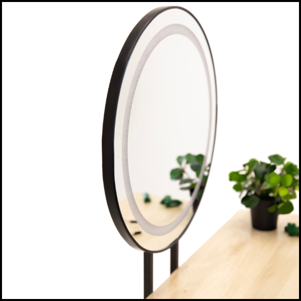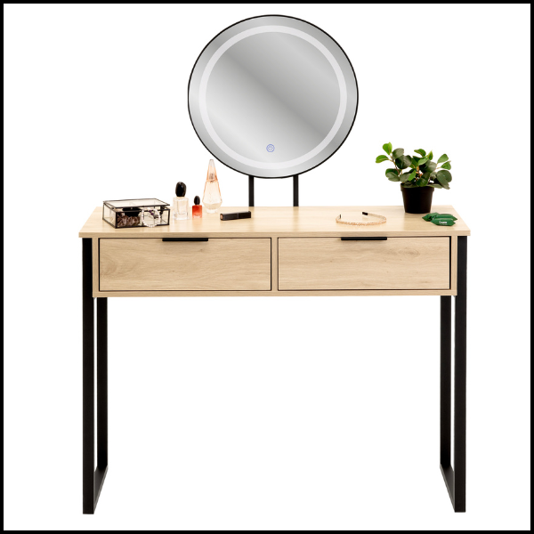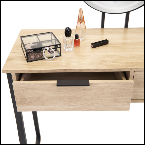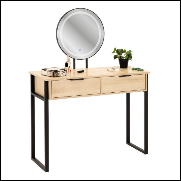 Poznaj toaletkę kosmetyczną LOFT 102x40 cm z podświetlanym lustrem LED, która łączy nowoczesny design z funkcjonalnością. Wykonana z wysokiej jakości płyty MDF w kolorze dąb sonoma, z solidnym stalowym stelażem w czarnym kolorze, stanowi stylowy i trwały mebel do każdej sypialni, garderoby czy pokoju kosmetycznego. Regulowane lustro LED o średnicy 48 cm pozwala dopasować kąt oświetlenia i wysokość do Twoich potrzeb, co sprawia, że makijaż i codzienna pielęgnacja stają się czystą przyjemnością.