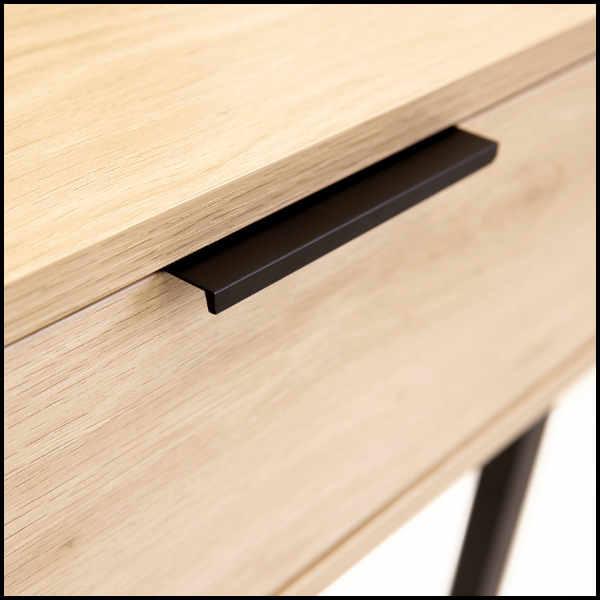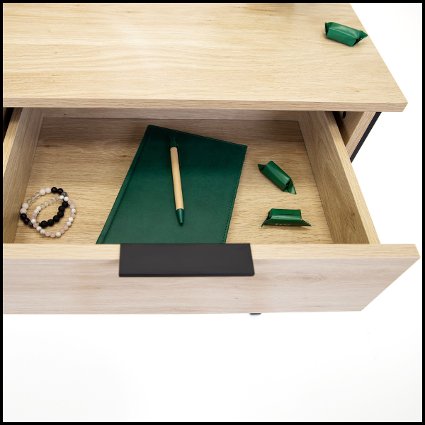 Fronty szuflad w kolorze dąb sonoma z czarnymi minimalistycznymi uchwytami to połączenie nowoczesnego designu z funkcjonalnością. Wykonane z wysokiej jakości płyty MDF, szuflady są trwałe, odporne na zarysowania i łatwe w utrzymaniu czystości. Dzięki nim każdy przedmiot – od kosmetyków, przez biżuterię, aż po drobne akcesoria – znajdzie swoje miejsce, a wnętrze pozostanie uporządkowane i eleganckie.