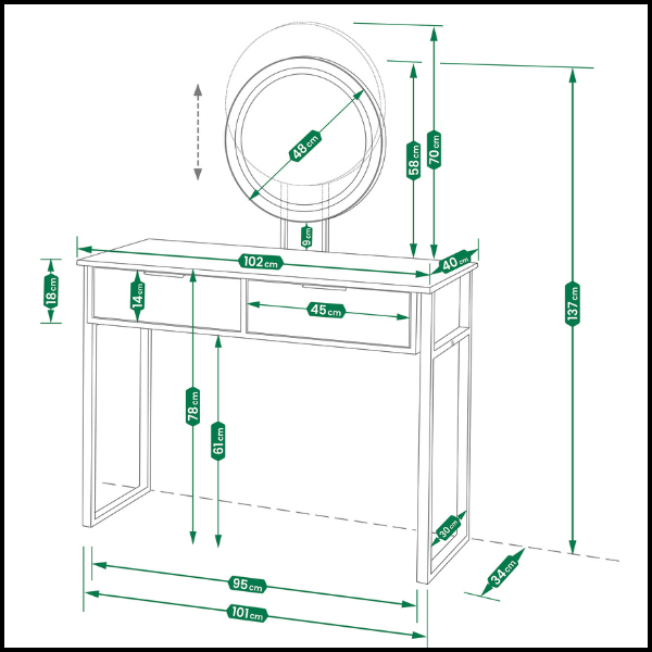 Solidna stalowa konstrukcja toaletki w połączeniu z nóżkami z malowanej proszkowo stali w kolorze czarnym gwarantuje stabilność, wytrzymałość i nowoczesny wygląd. Wysokość do blatu 78 cm zapewnia komfort użytkowania podczas pracy, makijażu czy innych codziennych czynności. Minimalistyczny, loftowy design sprawia, że mebel doskonale wpisuje się w nowoczesne wnętrza, jednocześnie zachowując trwałość na lata.