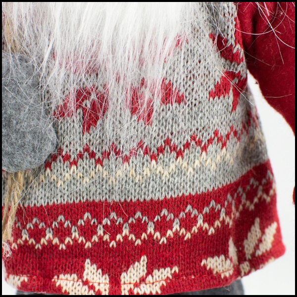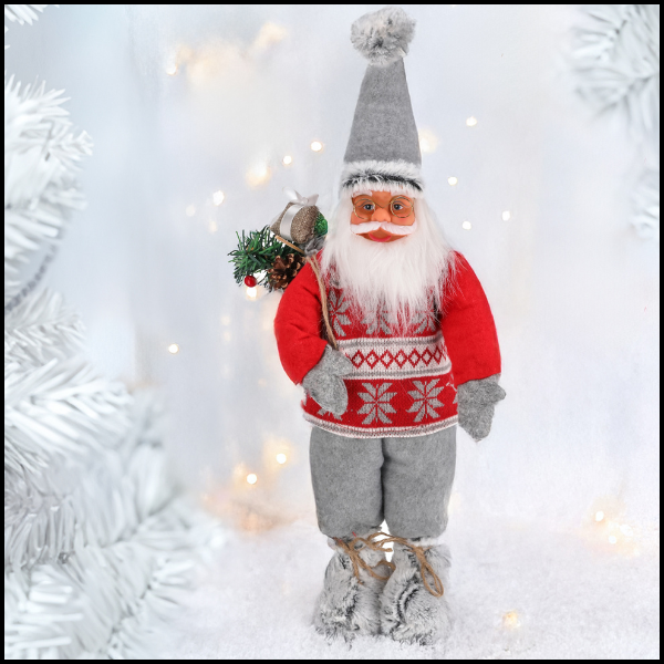 Na plecach nosi worek z prezentami co doskonale wpisuje się w naturalne, zimowe aranżacje inspirowane tradycją. Całość dopełniają szare, puszyste,solidne buty, które zapewniają stabilność figurki i sprawiają, że skrzat pozostanie na swoim miejscu.